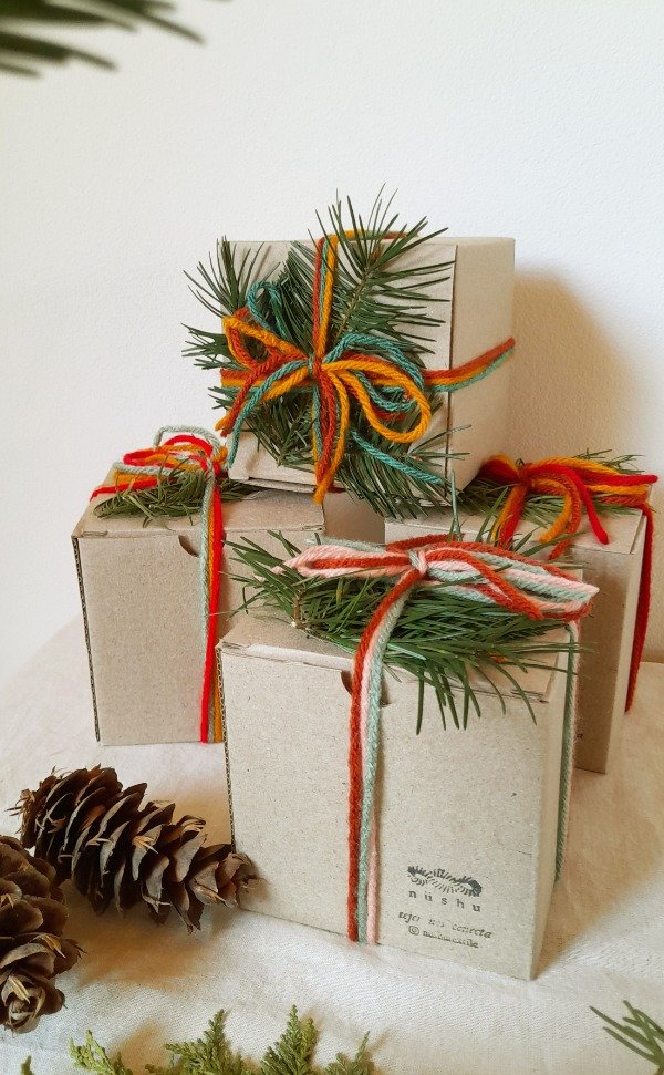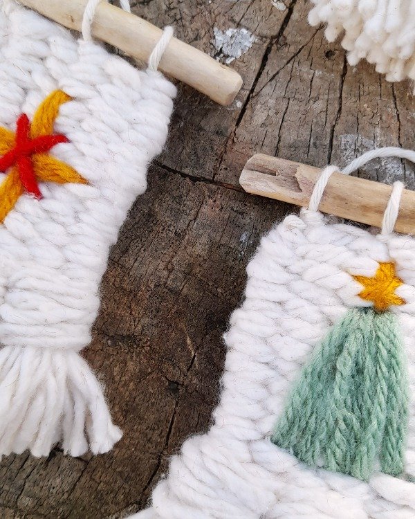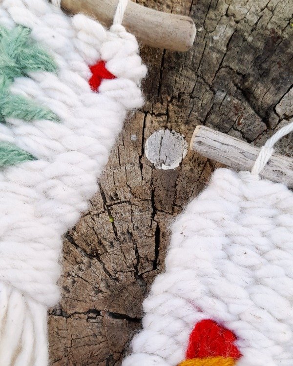 Este set incluye 4 pequeños textiles que tejí en telar y en los que luego bordé figuras representativas de la Navidad: árbol con estrella, bastoncito de caramelo, estrella y hoja de muérdago.